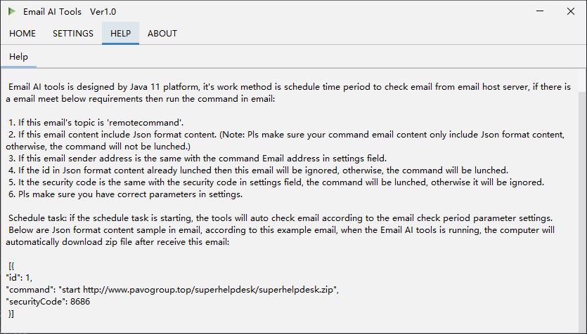 Email 自动化工具是一个基于Java 11版开发的自动化的工具, 当你需要你的电脑自动执行你的命令的时候,只需要发一封附带了批处理命令程序的邮件到你的指定的邮箱,那么EMail AI Tools就会自动处理你的命令邮件,执行指令,完成你的自动化任务。快快下载尝试一下吧!(暂时只开发了英文版本,中文版本稍后推出)。