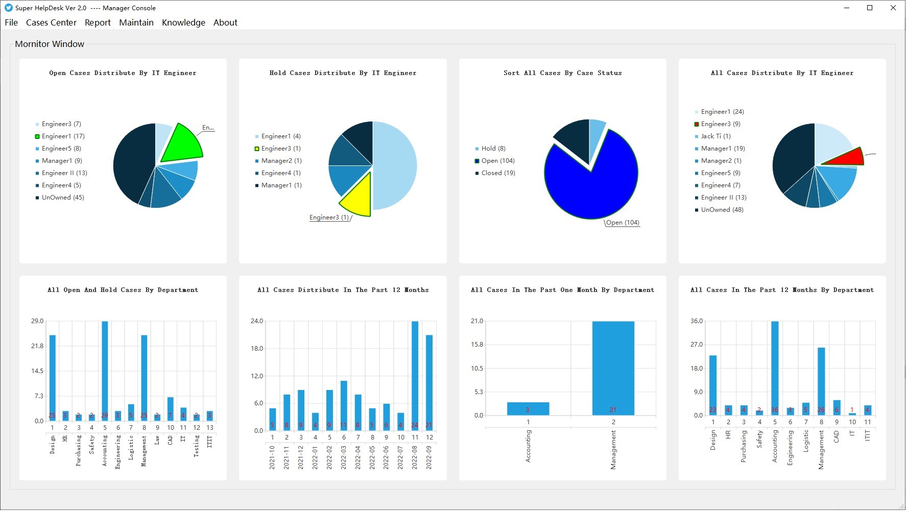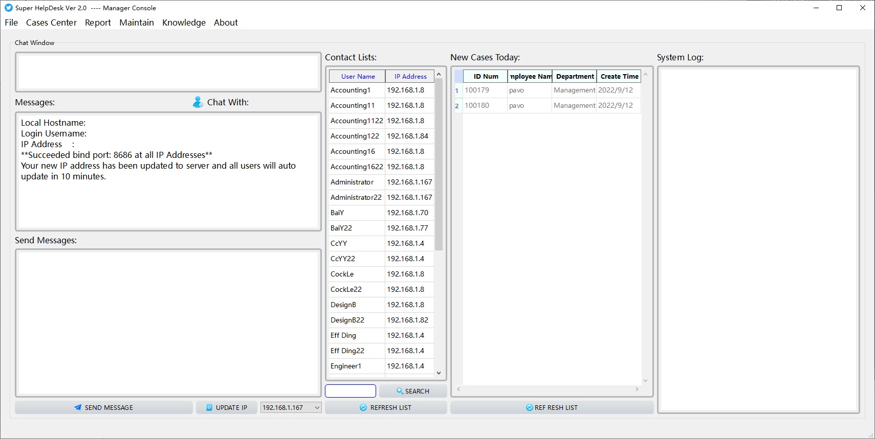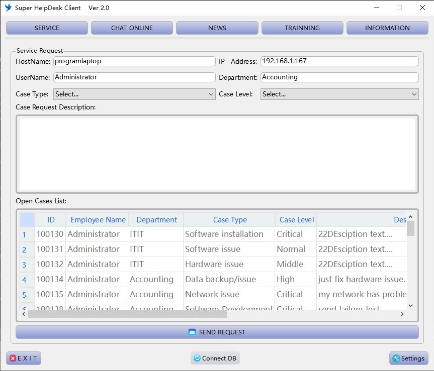 Super HelpDesk is a free sofware to help IT department to collect case request then follow cases to user, it can auto generate monitor window for manager to monitor IT team jobs, and IT enginner can take case/handle over case/close case/update case easily. also each case will be logged in records can be review at anytime. in this system, provide chat function also, the employee can contact with IT easily while they are not suitable to give phone call to IT helpdesk team.
