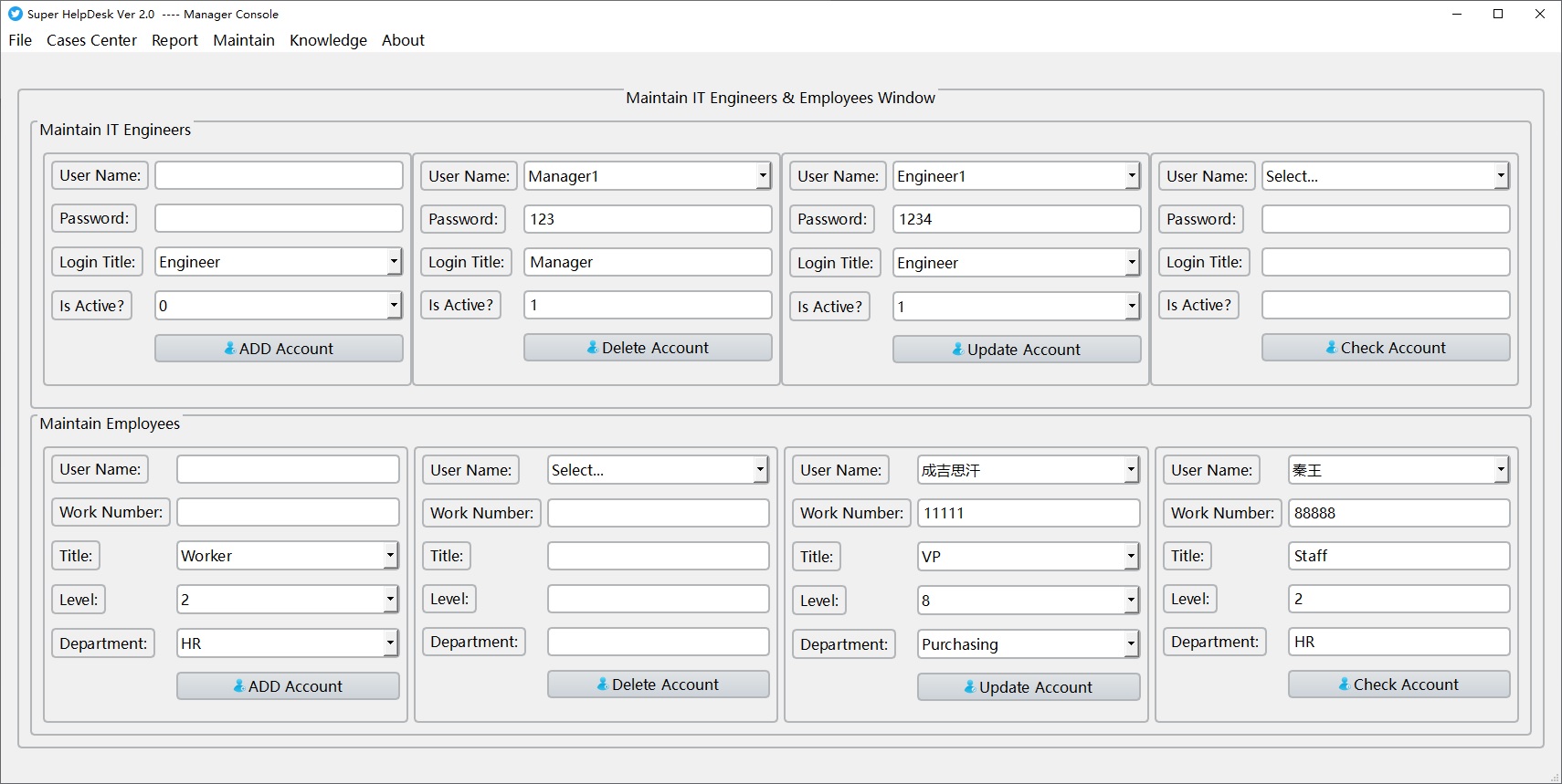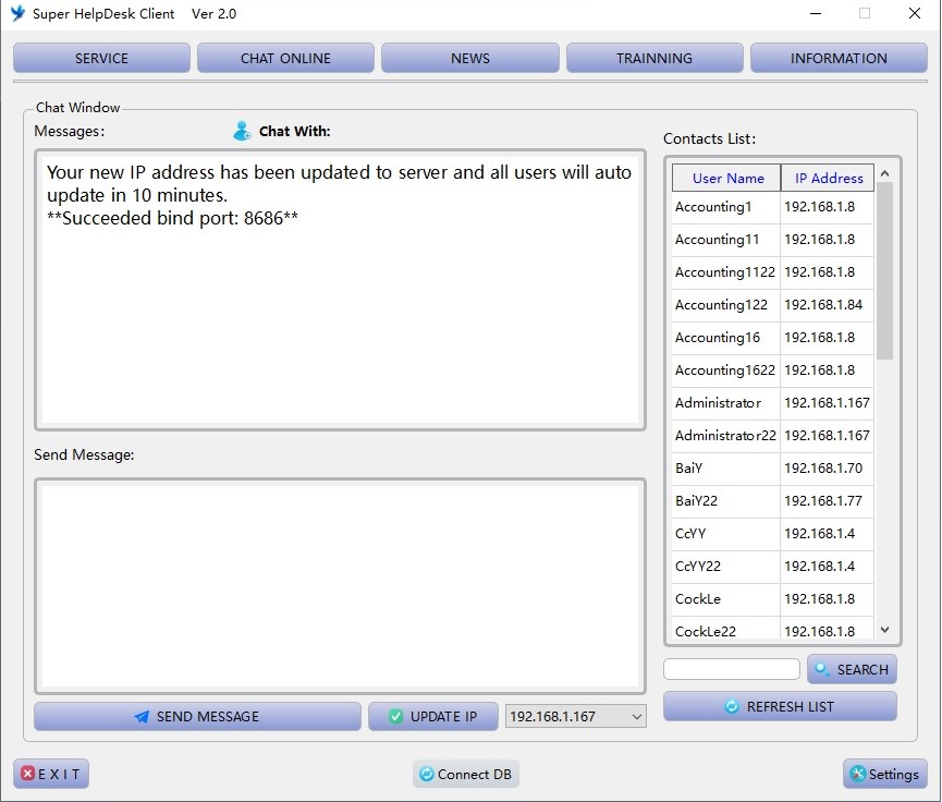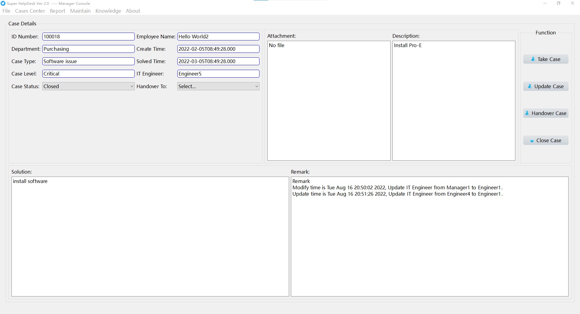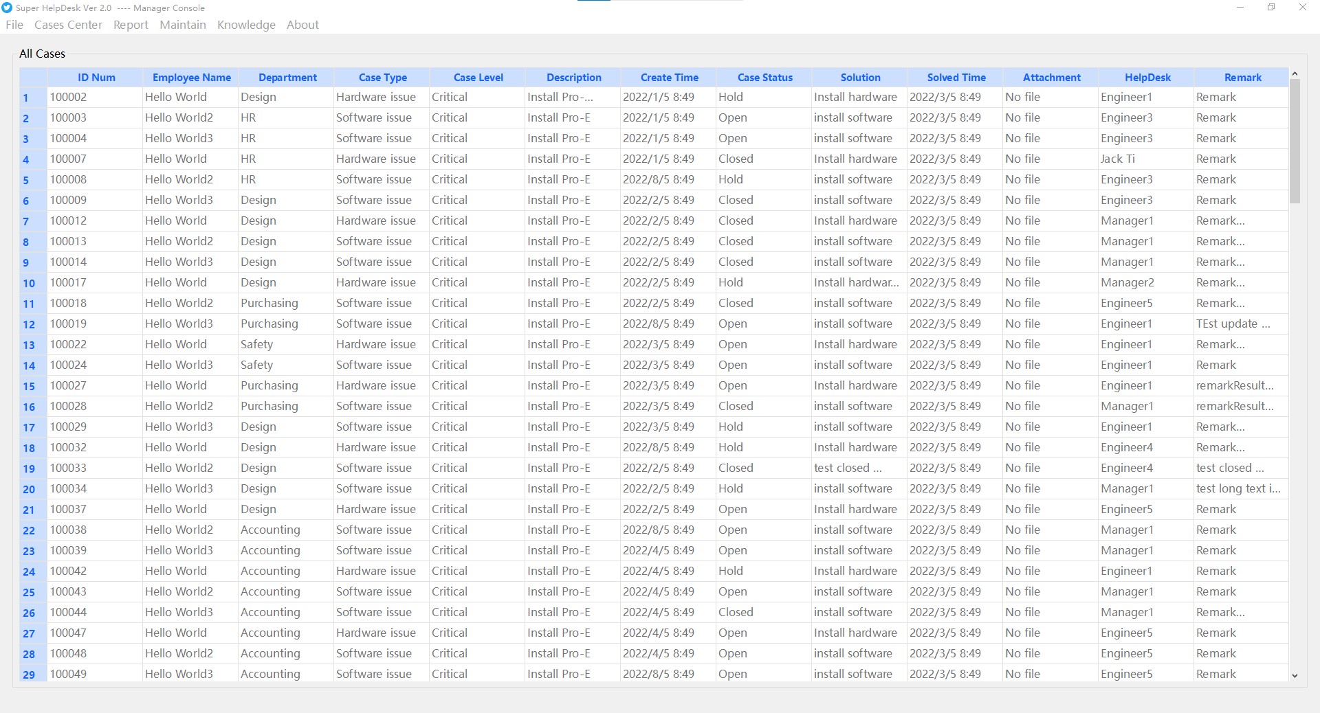 Super HelpDesk is a free sofware to help IT department to collect case request then follow cases to user, it can auto generate monitor window for manager to monitor IT team jobs, and IT enginner can take case/handle over case/close case/update case easily. also each case will be logged in records can be review at anytime. in this system, provide chat function also, the employee can contact with IT easily while they are not suitable to give phone call to IT helpdesk team.